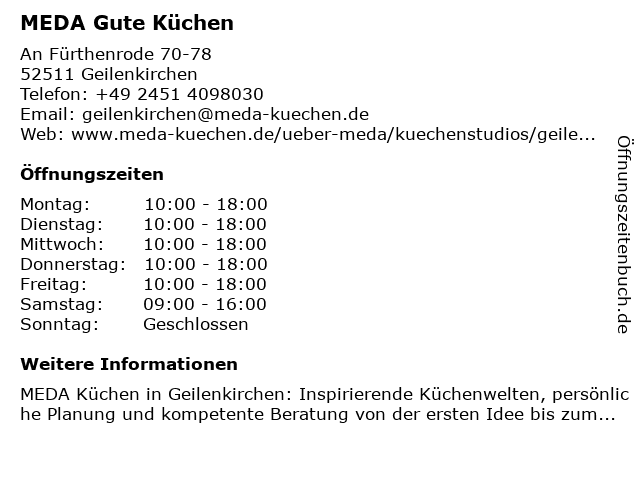 | Öffnungszeiten MEDA Gute Küchen in Geilenkirchen anzeigen | |
