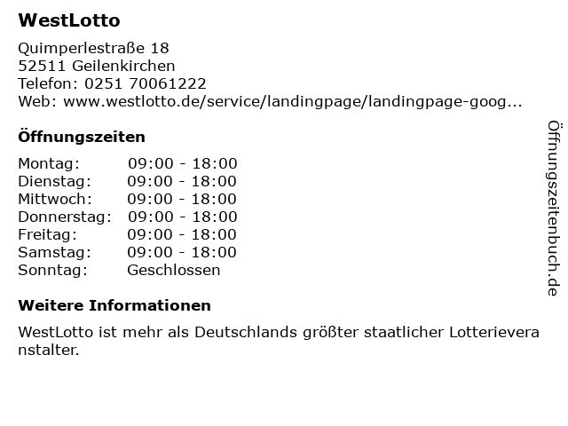 | Öffnungszeiten WestLotto in Geilenkirchen anzeigen | |