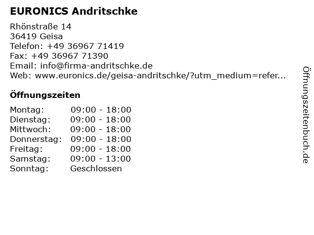 | Öffnungszeiten EURONICS Andritschke in Geisa anzeigen | |