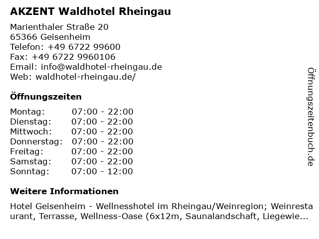 | Öffnungszeiten AKZENT Waldhotel Rheingau in Geisenheim anzeigen | |