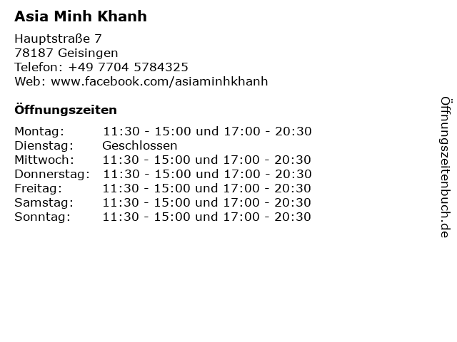 | Öffnungszeiten Asia Minh Khanh in Geisingen anzeigen | |