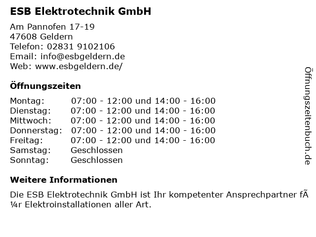 | Öffnungszeiten ESB Elektrotechnik GmbH in Geldern anzeigen | |