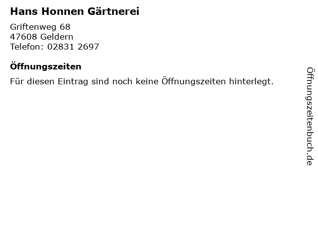 | Telefonnummer Hans Honnen Gärtnerei in Geldern (02831 2697) anrufen | |
