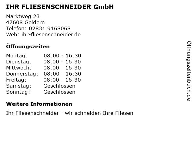 | Öffnungszeiten IHR FLIESENSCHNEIDER GmbH in Geldern anzeigen | |
