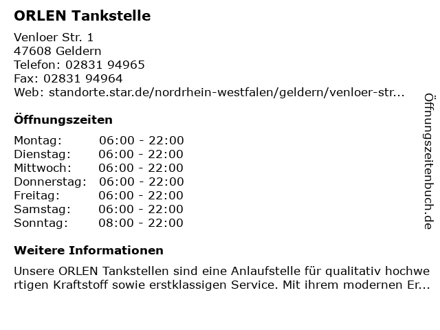 | Öffnungszeiten ORLEN Tankstelle in Geldern anzeigen | |