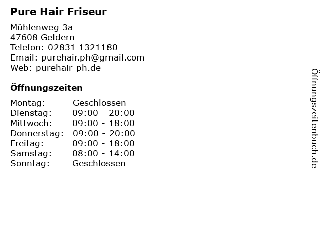 | Öffnungszeiten Pure Hair Friseur in Geldern anzeigen | |
