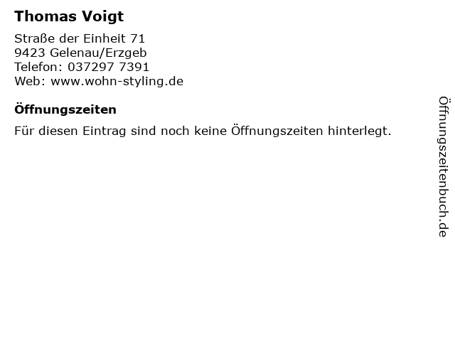 | Öffnungszeiten Thomas Voigt in Gelenau/Erzgeb anzeigen | |