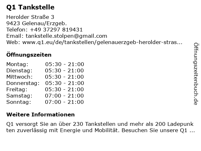 | Öffnungszeiten Q1 Tankstelle in Gelenau/Erzgeb. anzeigen | |