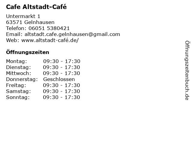 | Öffnungszeiten Cafe Altstadt-Café in Gelnhausen anzeigen | |