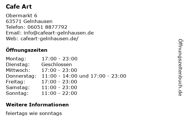 | Öffnungszeiten Cafe Art in Gelnhausen anzeigen | |