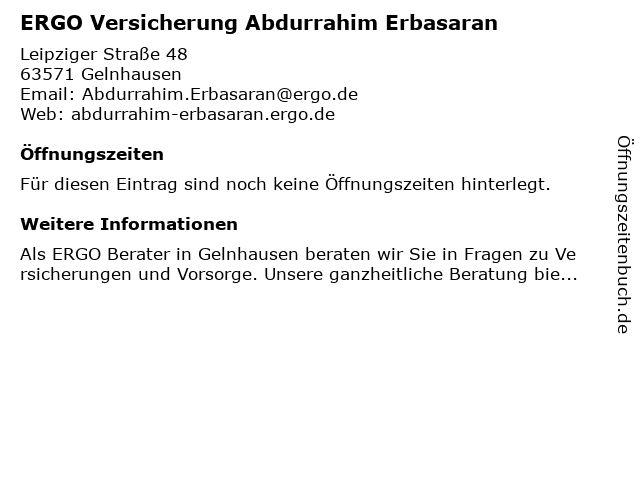 | Öffnungszeiten ERGO Versicherung Abdurrahim Erbasaran in Gelnhausen anzeigen | |