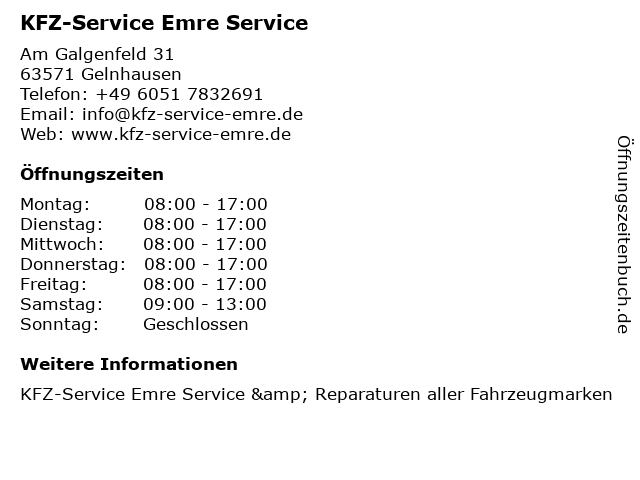 | Öffnungszeiten KFZ-Service Emre Service in Gelnhausen anzeigen | |
