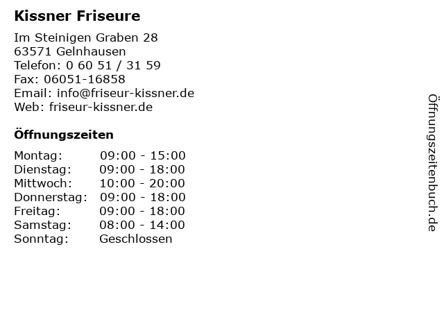| Öffnungszeiten Kissner Friseure in Gelnhausen anzeigen | |