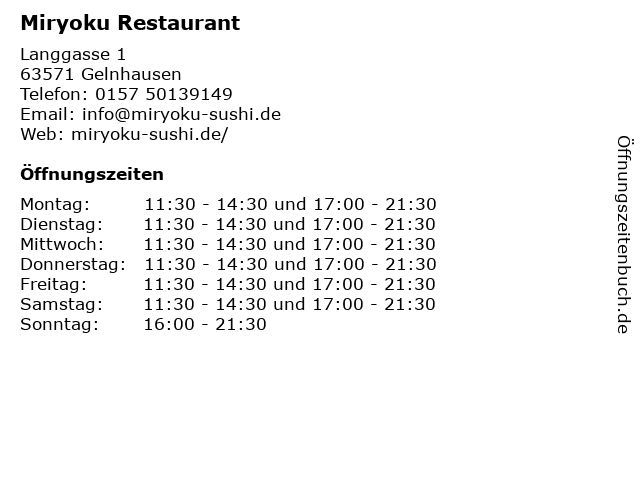 | Öffnungszeiten Miryoku Restaurant in Gelnhausen anzeigen | |