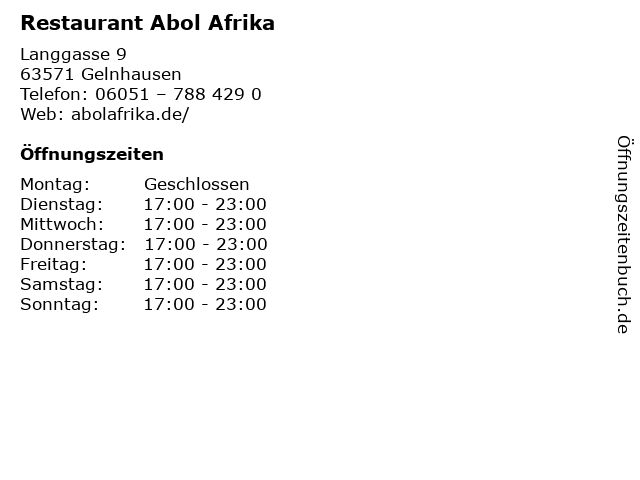 | Öffnungszeiten Restaurant Abol Afrika in Gelnhausen anzeigen | |