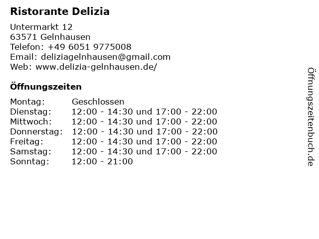 | Öffnungszeiten Ristorante Delizia in Gelnhausen anzeigen | |