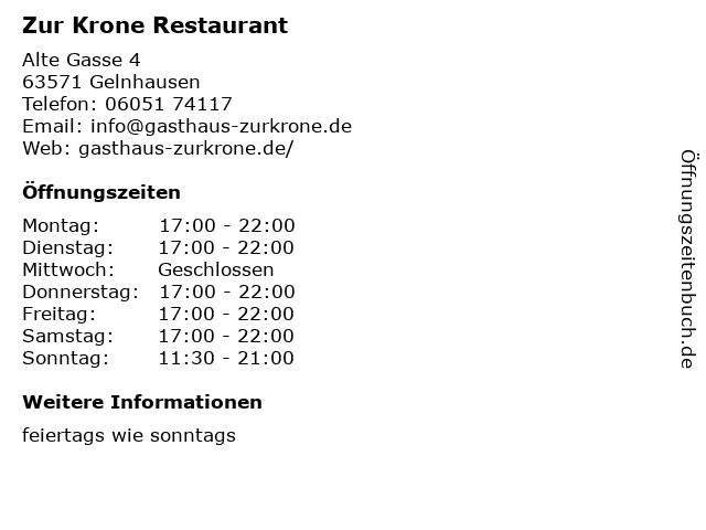 | Öffnungszeiten Zur Krone Restaurant in Gelnhausen anzeigen | |
