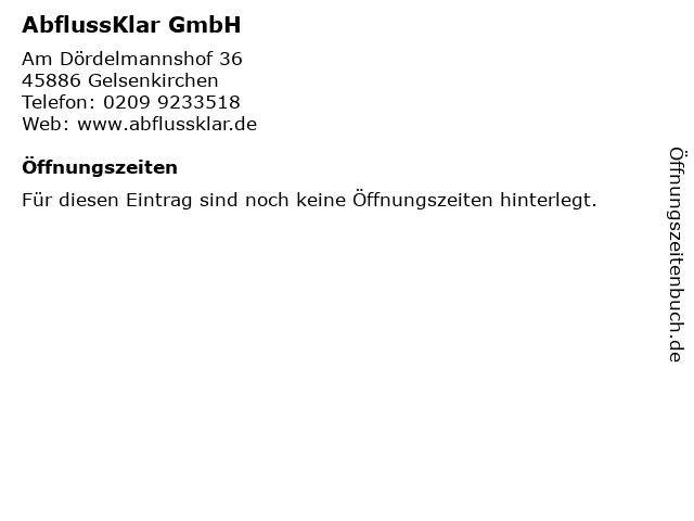 | Öffnungszeiten AbflussKlar GmbH in Gelsenkirchen anzeigen | |