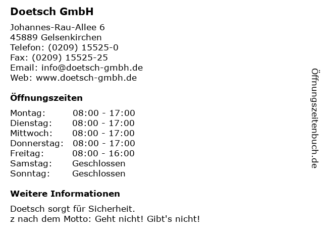 | Öffnungszeiten Doetsch GmbH in Gelsenkirchen anzeigen | |