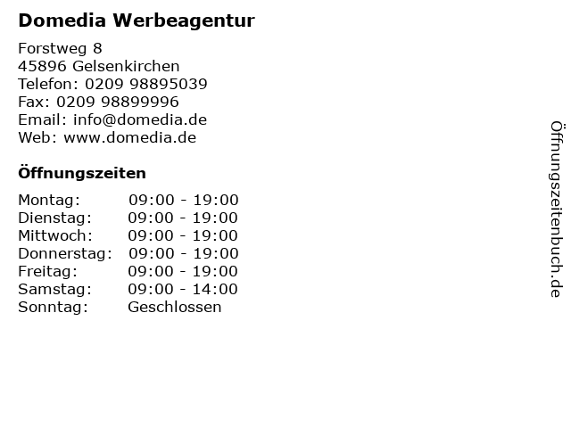 | Öffnungszeiten Domedia Werbeagentur in Gelsenkirchen anzeigen | |