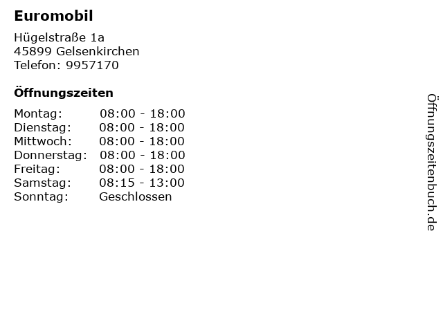 | Öffnungszeiten Euromobil in Gelsenkirchen anzeigen | |