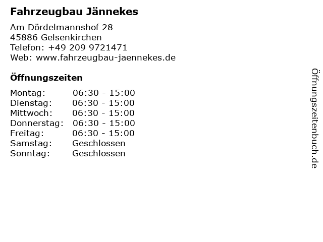 | Öffnungszeiten Fahrzeugbau Jännekes in Gelsenkirchen anzeigen | |