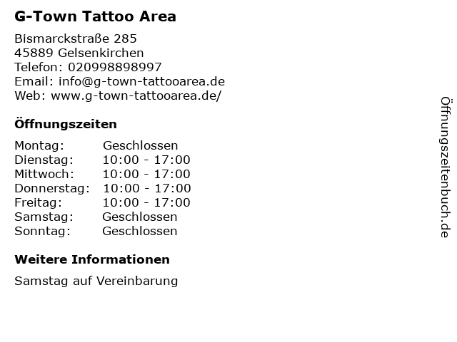 | Öffnungszeiten G-Town Tattoo Area in Gelsenkirchen anzeigen | |