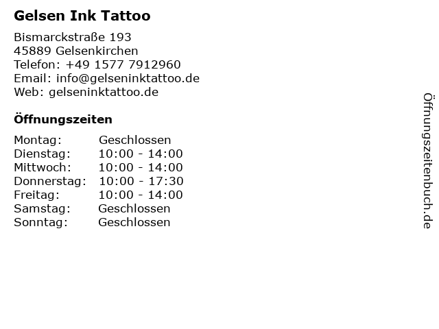 | Öffnungszeiten Gelsen Ink Tattoo in Gelsenkirchen anzeigen | |