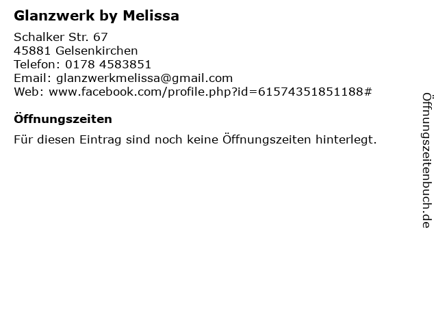 | Öffnungszeiten Glanzwerk by Melissa in Gelsenkirchen anzeigen | |