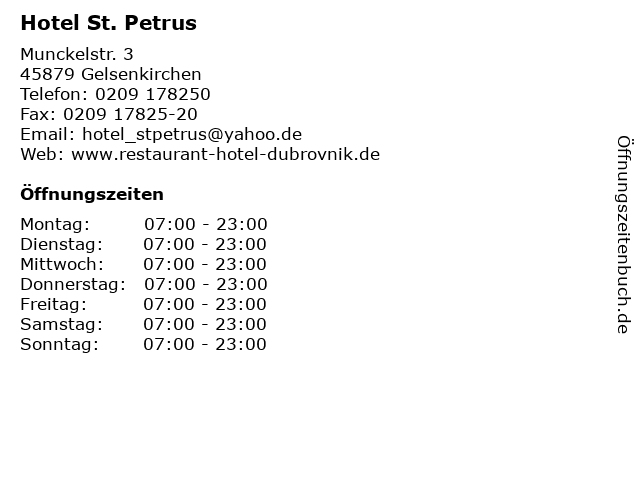 | Öffnungszeiten Hotel St. Petrus in Gelsenkirchen anzeigen | |