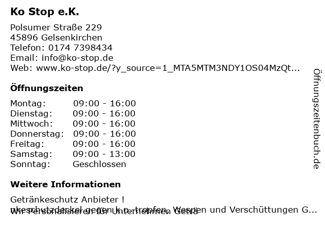 | Öffnungszeiten Ko Stop e.K. in Gelsenkirchen anzeigen | |
