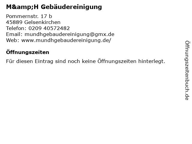 | Öffnungszeiten M&H Gebäudereinigung in Gelsenkirchen anzeigen | |