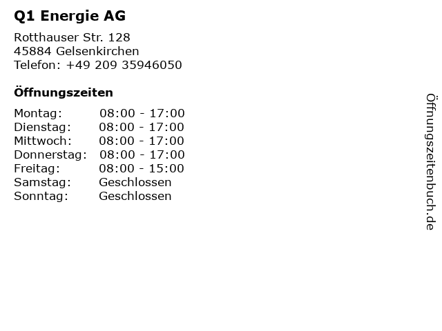 | Öffnungszeiten Q1 Energie AG in Gelsenkirchen anzeigen | |