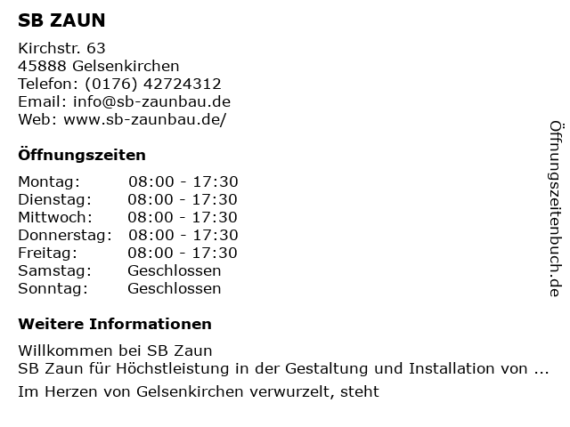 | Öffnungszeiten SB ZAUN in Gelsenkirchen anzeigen | |