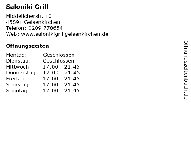 | Öffnungszeiten Saloniki Grill in Gelsenkirchen anzeigen | |