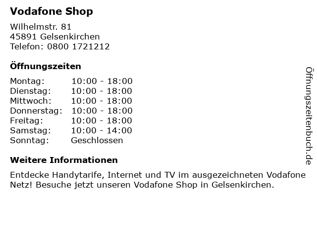 | Öffnungszeiten Vodafone Shop in Gelsenkirchen anzeigen | |