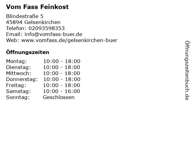 | Öffnungszeiten Vom Fass Feinkost in Gelsenkirchen anzeigen | |