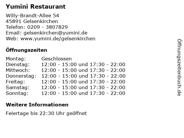| Öffnungszeiten Yumini Restaurant in Gelsenkirchen anzeigen | |