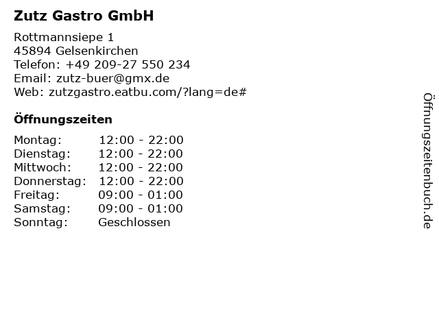 | Öffnungszeiten Zutz Gastro GmbH in Gelsenkirchen anzeigen | |