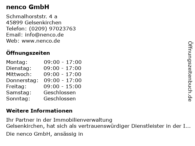 | Öffnungszeiten nenco GmbH in Gelsenkirchen anzeigen | |