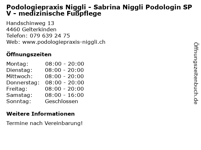 Branchen & Suchbegriffe zu Podologiepraxis Niggli - Sabrina Niggli Podologin SPV - medizinische Fußpflege:fussmassage, fusspflege, fußpflege, hornhautentfernung, medizinische, niggli, podologie, podologiepraxis, podologin, sabrina, spv |