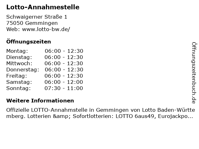 | Öffnungszeiten Lotto-Annahmestelle in Gemmingen anzeigen | |