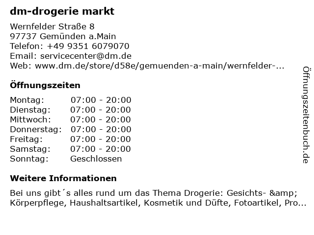 | Öffnungszeiten dm-drogerie markt in Gemünden a.Main anzeigen | |