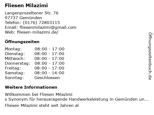 | Öffnungszeiten Fliesen Milazimi in Gemünden anzeigen | |