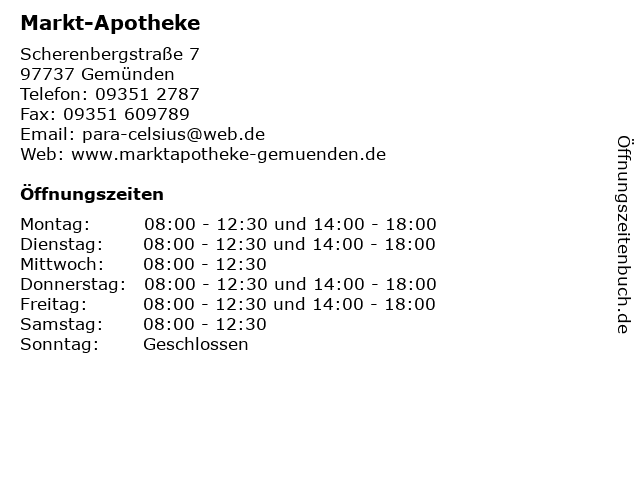| Öffnungszeiten Markt-Apotheke in Gemünden anzeigen | |