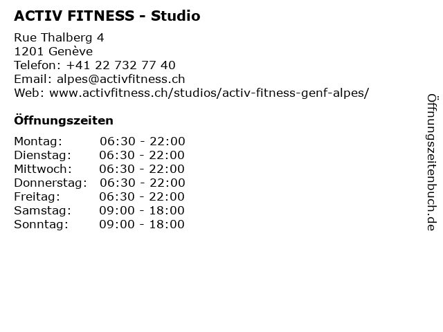 | Öffnungszeiten ACTIV FITNESS - Studio in Genève anzeigen | |