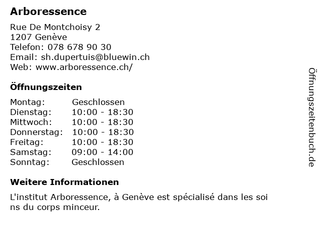 | Öffnungszeiten Arboressence in Genève anzeigen | |