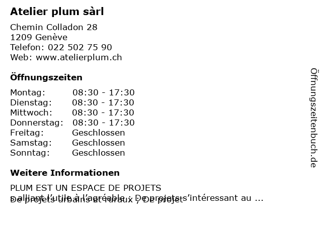 | Öffnungszeiten Atelier plum sàrl in Genève anzeigen | |