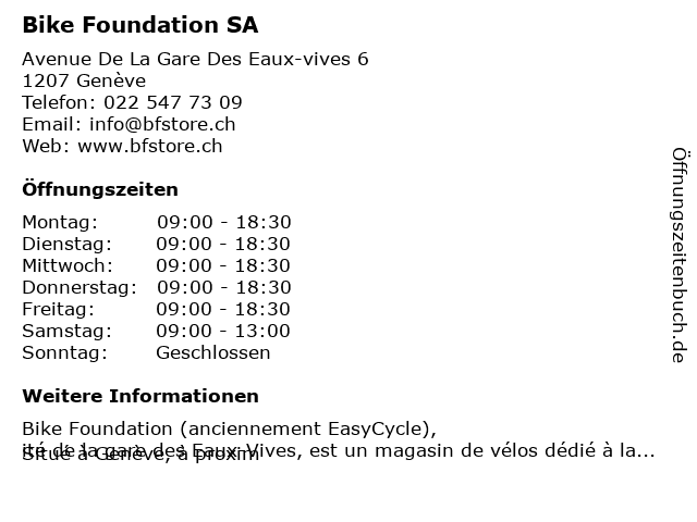 | Öffnungszeiten Bike Foundation SA in Genève anzeigen | |