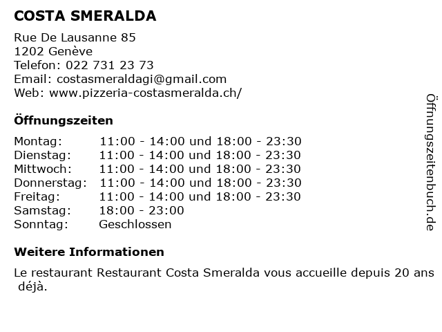 | Öffnungszeiten COSTA SMERALDA in Genève anzeigen | |